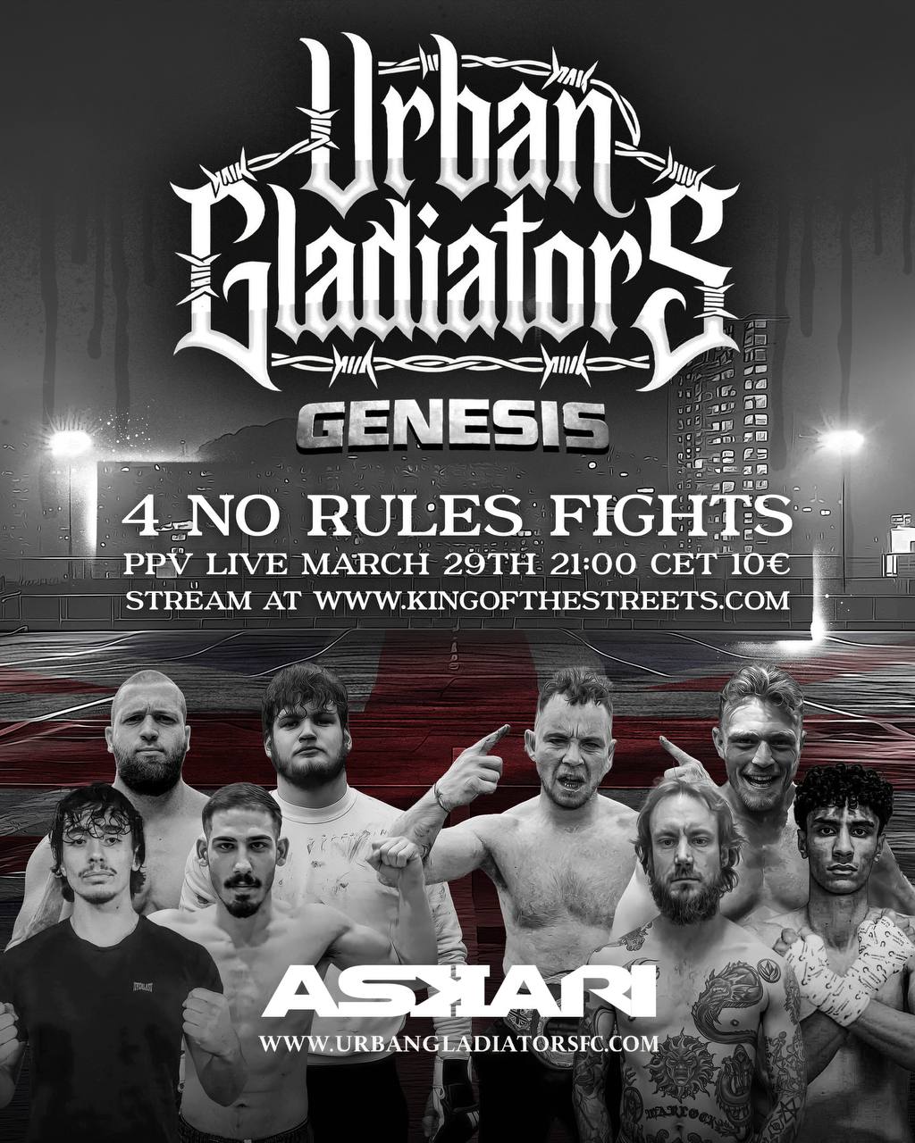 Watch the event “GENESIS” from the organization URBAN GLADIATORS from the UK. Get exclusive access to watch it here. Featuring 5 savage fights with no rules, no rounds.